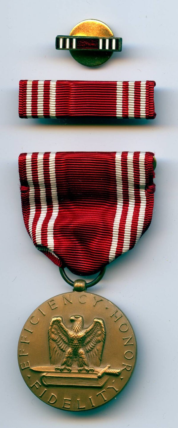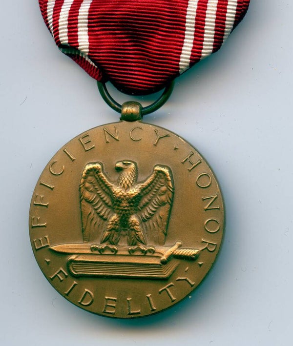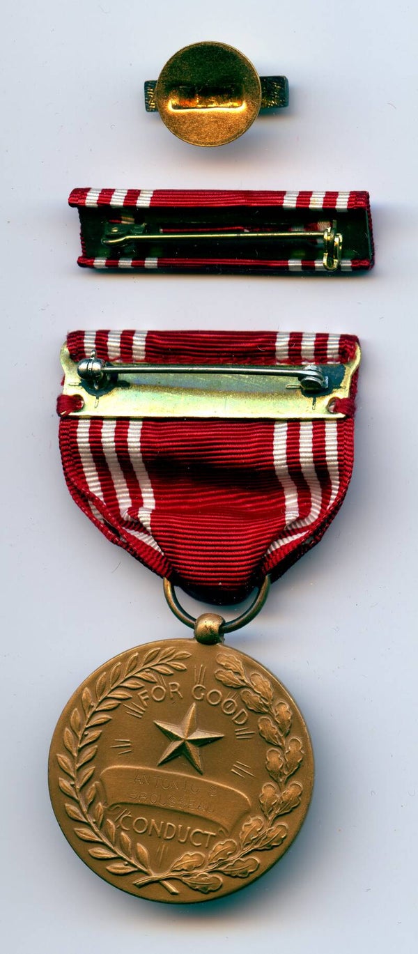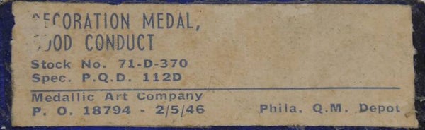 WW2 original Named Cased Good Conduct Medal. The medal comes in its original blue box of issue, which remains in good condition. Next to the medal, the box also contains the original ribbon bar and lapel pin. The medal has a slot brooch mechanism and is named to Antonio S. Brousseau. The set remains in an excellent condition. Nice set with research potential! No repairs, no damage.