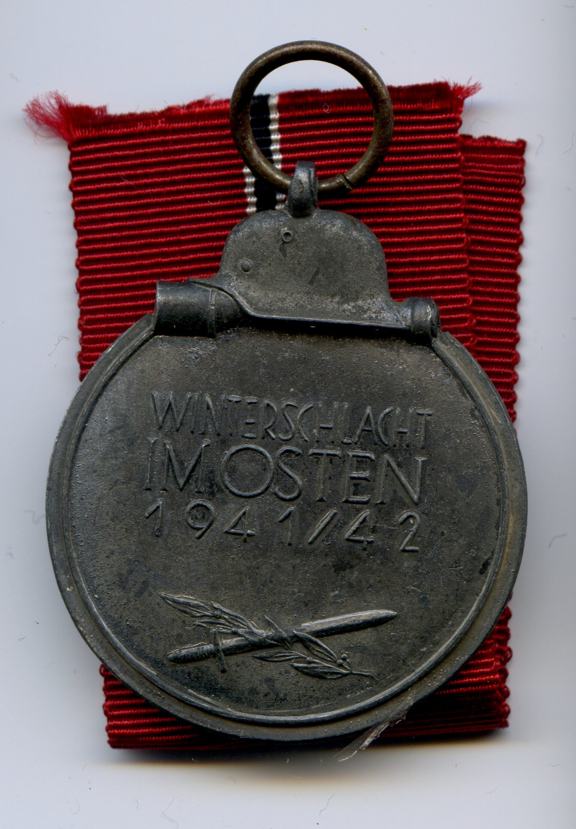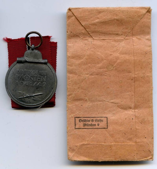 Nice original East Front medal with pouch, produced by Deschler & Sohn, München. The medal is made out of zinc and comes with its original piece of short ribbon and pouch, which is marked "Deschler & Sohn München 9". The medal is a non maker marked example. Nice original set in good condition! No repairs, no damage.