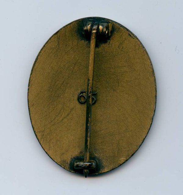 Nice worn gold wound badge by Klein & Quenzer AG, Idar-Oberstein. Zinc construction with most of the gold finish present. The medal is marked on the back with PKZ code "65" indicating production by K&Q. This badge is the rarer marked variant by K&Q with the "65" at the middle of the badge instead of on the bottom of the reverse. Nice hard to find badge in great condition. No repairs, no damage!