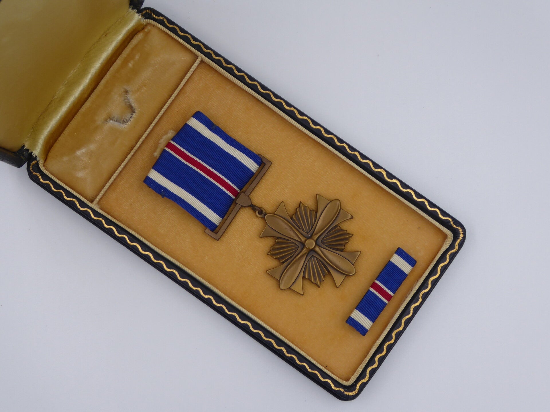 An original WW2 cased Distinguished Flying Cross. The medal comes in its original case of issue together with its ribbon bar. The medal comes with a slot brooch, indicating production during WW2. Great set in excellent condition! No repairs, no damage.
