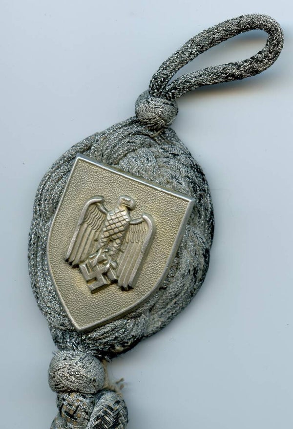 Very nice Heer shooting lanyard. First pattern example. Aluminum shield pierced through the lanyard with 3 soldered on prongs. Nice worn condition. No repairs, no damage.
