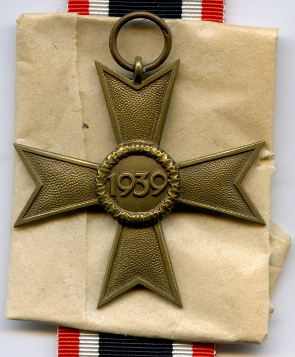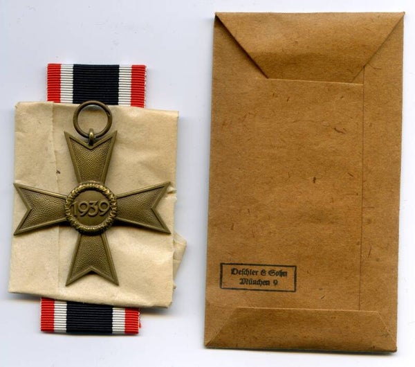 Nice and complete KVK 2nd Class without Swords by Deschler & Sohn, München. Buntmetall construction. The medal is marked on the ring with PKZ code "1" indicating production by D&S. Nice cross in mint unissued condition, comes with its original long ribbon, wrapping paper and maker marked package. This cross originates from the famous "Deschler Hoard". Nice original complete set with mint cross! No repairs, no damage.