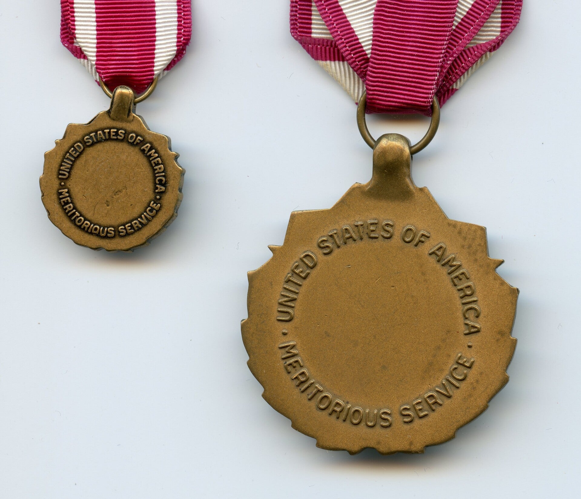 A nice original Post WW2 Meritorious Service Medal with Miniature.The medal and miniature come with a crimp brooch, indicating post WW2 production.Very nice Meritorious Service Medal with Miniature in near mint condition! No repairs, no damage.