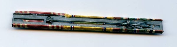 Nice WW2 US Ribbon Bar for the Good Conduct, American Defense and European-African-Middle Eastern Campaign Medal. The ribbon bar remains in an excellent shape and comes with 4 battle stars for the EAME Campaign Medal. Excellent ribbon bar with some hard earned devices on it! No repairs, no damage.
