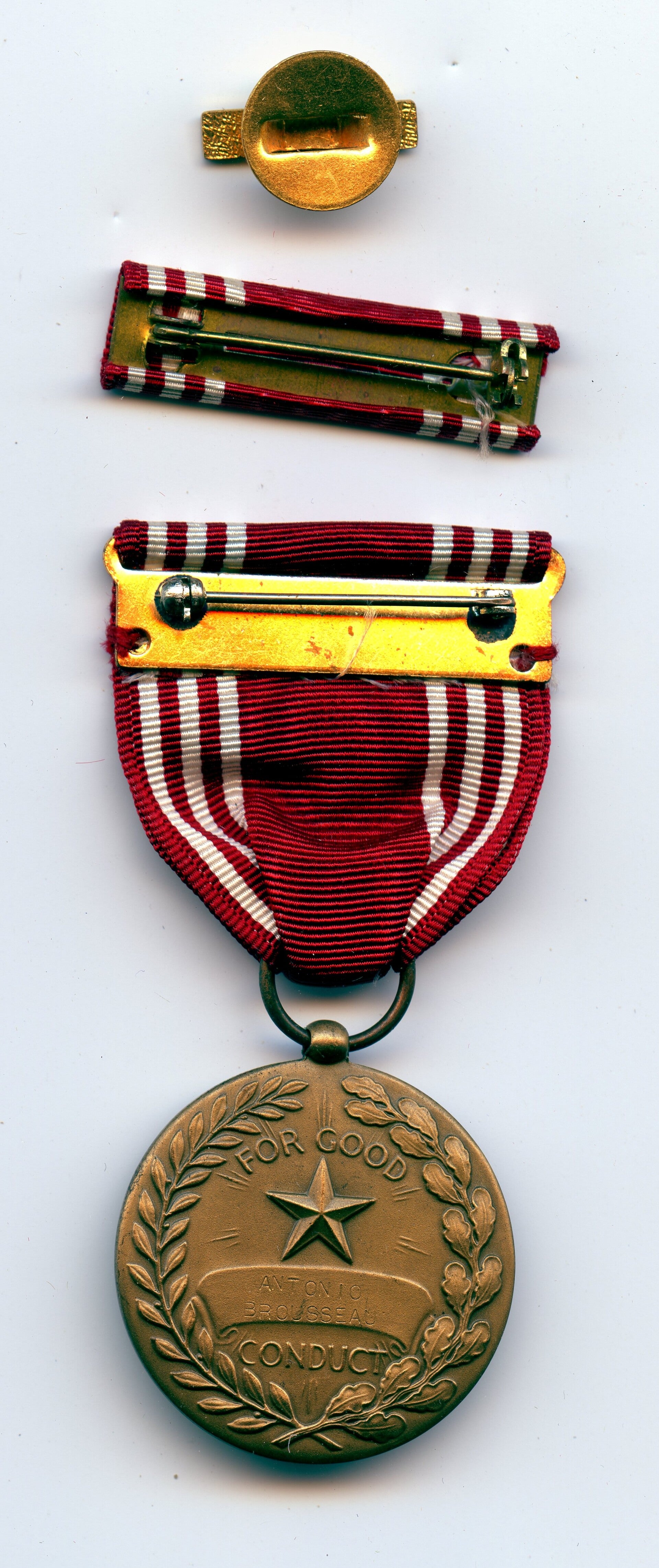 WW2 original Named Good Conduct Medal. The medal comes with its original lapel pin and ribbon bar and remains in good condition. The medal has a slot brooch mechanism and is named to Antonio S. Brousseau. The set remains in an excellent condition. Nice set with research potential! No repairs, no damage.