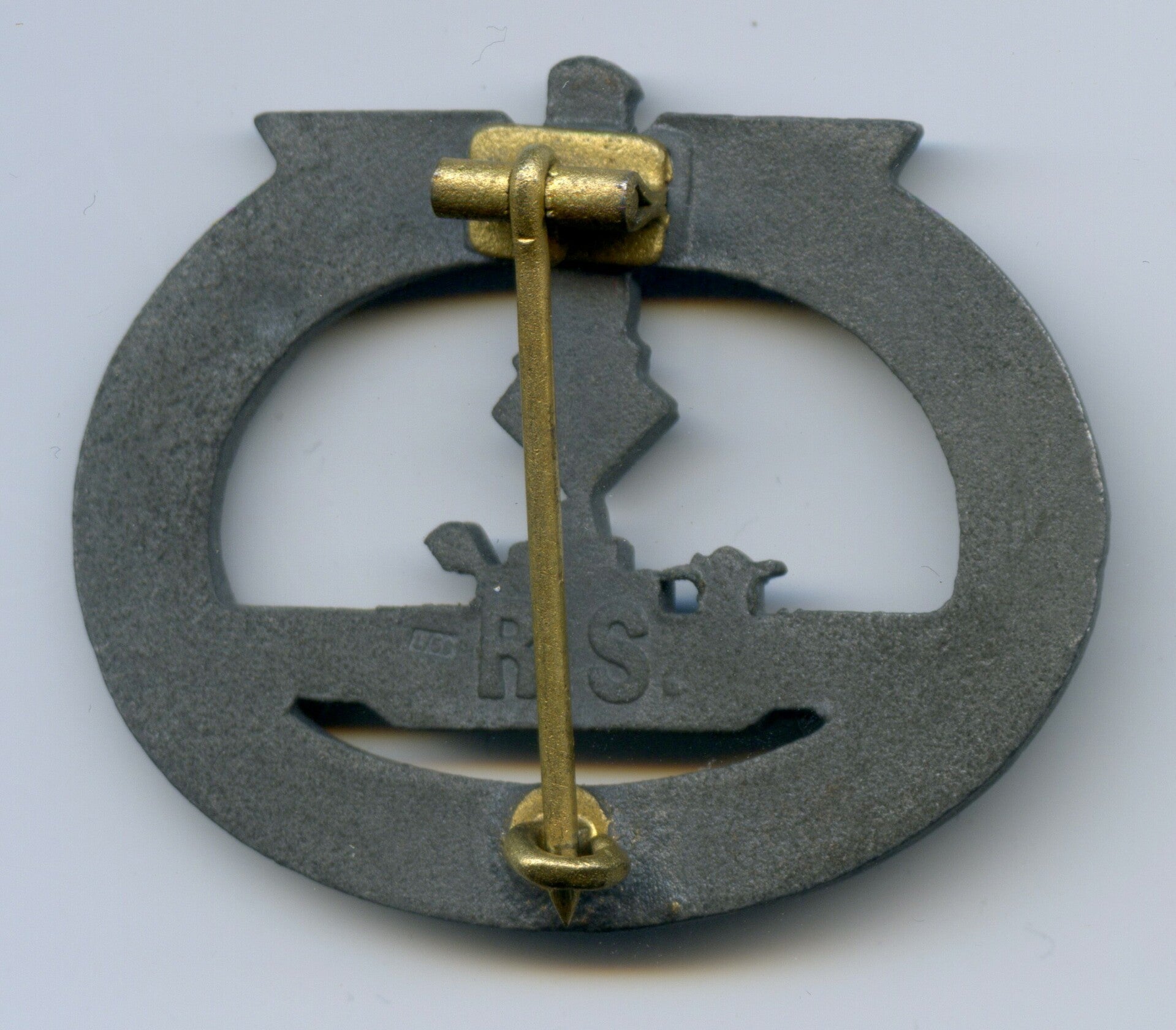 Excellent and rare double marked U-boat badge produced by Rudolf Souval, Vienna. Zinc construction with soldered on hardware. The badge is nicely maker marked on the reverse with R.S. and L/58 indicating production by Souval. The badge has unfortunately lost most of its finish but still has its golden pin and set up. Excellent and rare double marked wartime Souval U-boat badge. No repairs, no damage