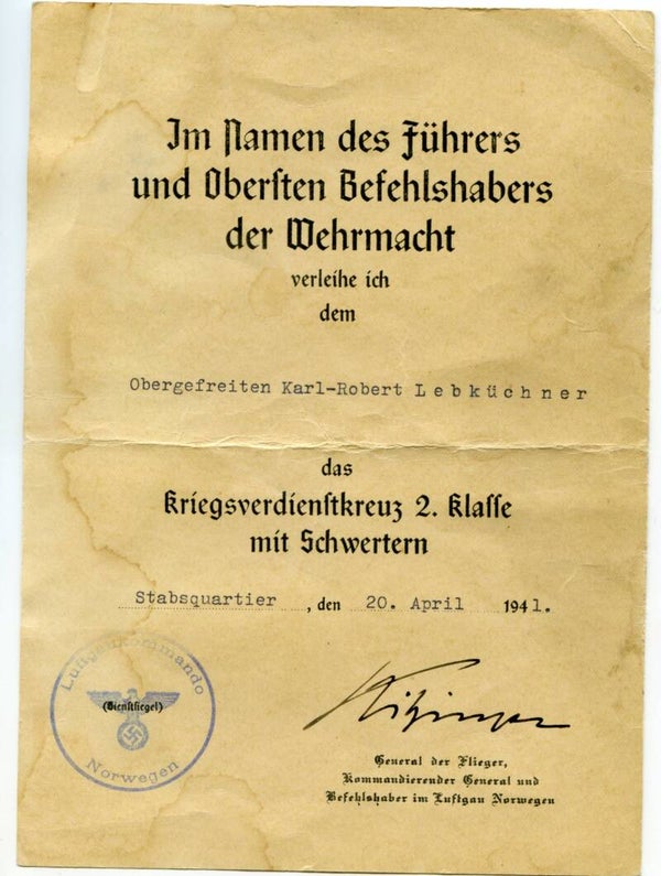 - War Merit Cross 2nd Class with Swords - 20 April 1941 - signed by Karl Kitzinger the General and commander of Luftgau Norwegen.