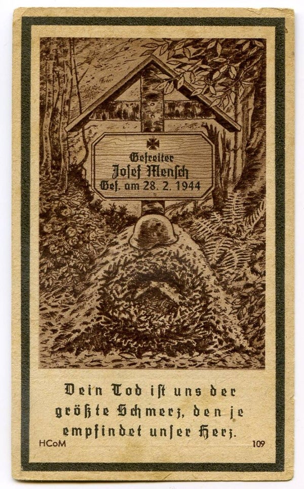 Death Card to Gefreiter Josef Mensch, Fallschirmjäger Rgt, Italy 1944