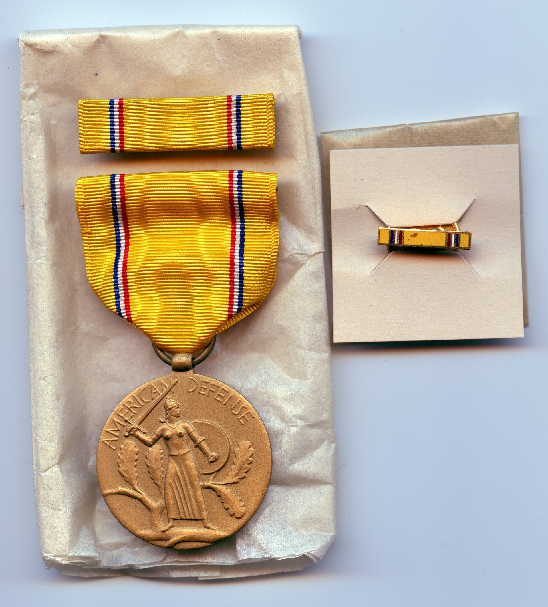Very nice mint WW2 original Cased American Defense Medal set. The medal comes in its original blue box of issue together with the ribbon bar and lapel pin. The medal has a slot brooch mechanism and remains in an excellent mint condition. Nice hard to upgrade set! No repairs, no damage.
