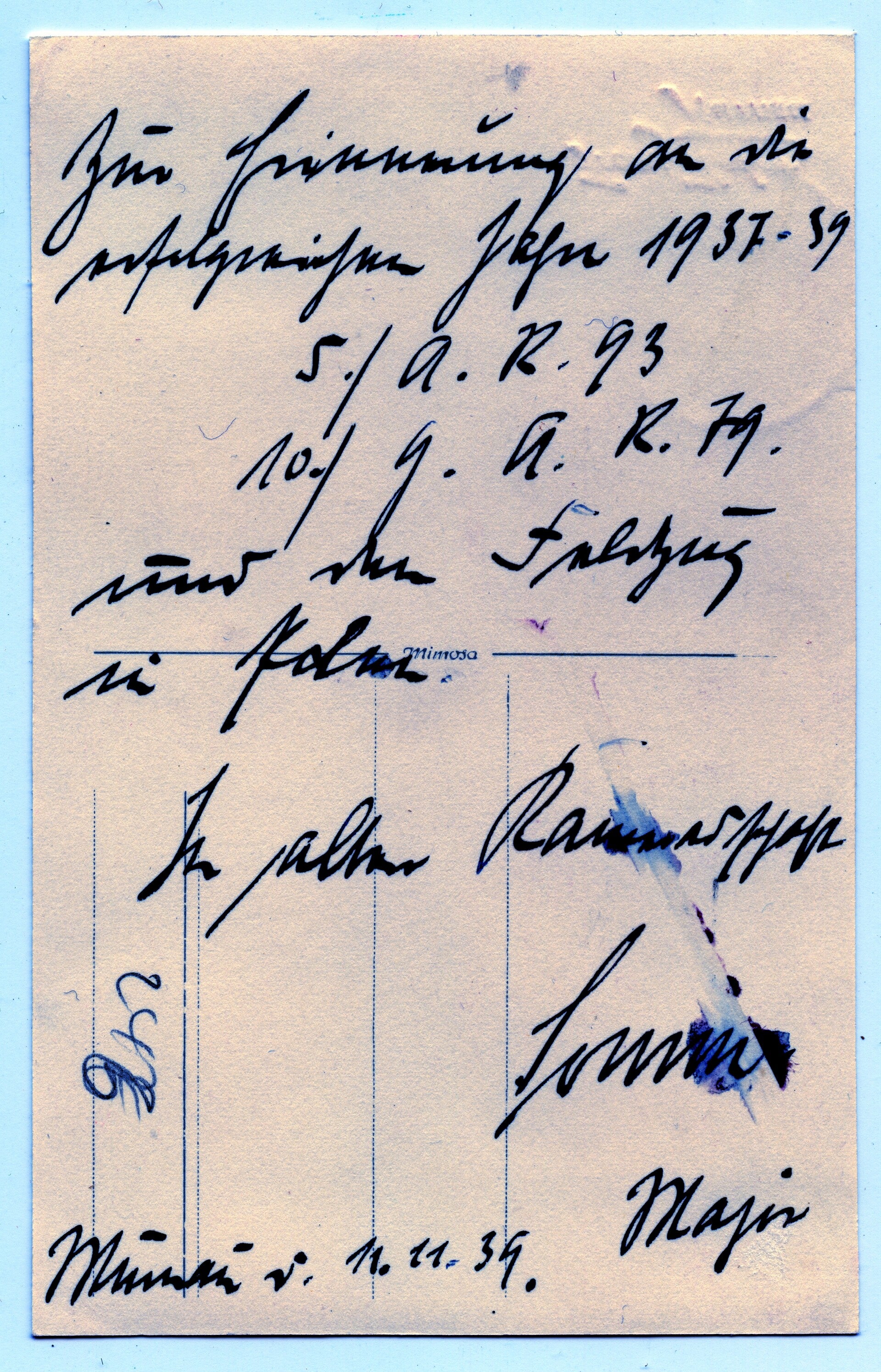 Nice Gebirgsjäger postcard size portrait photo to a Major of the 10th Kompanie of Gebirgs-Artillerie Regiment 79 of the 1st Gebirgs-Division. The Major is nicely wearing his bergmütze and showing his Ribbon for the Iron Cross 2nd Class with clasp and an extensive ribbon bar for various awards. There is also writing on the back of portrait indicating his service with 10./G.A.R. 79. Excellent portrait photo! No repairs, no damage.